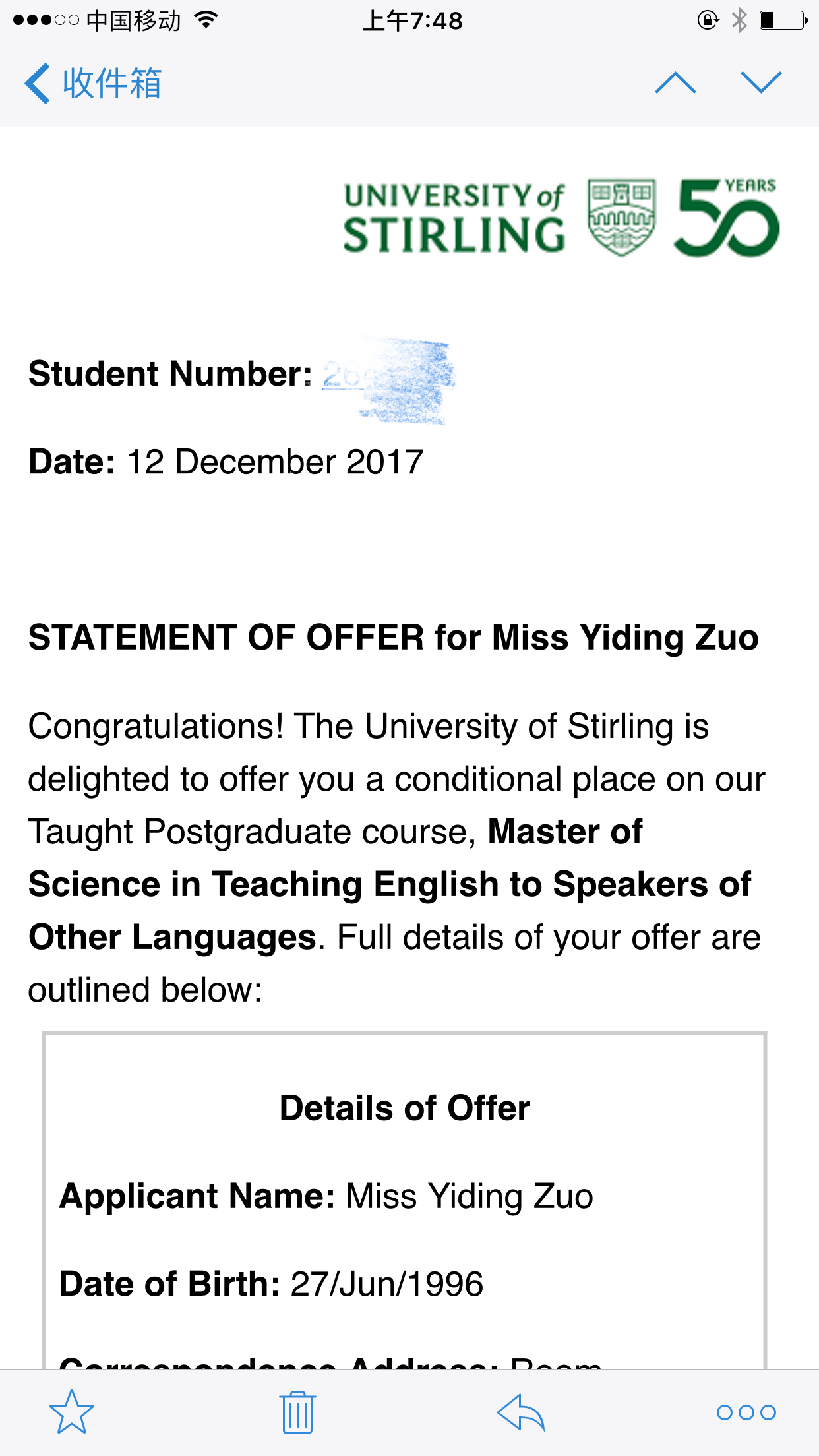 恭喜左同學(xué)獲得英國考文垂大學(xué),英語(yǔ)教學(xué)與應用語(yǔ)言學(xué)碩士錄?。。?!